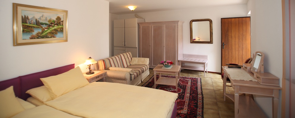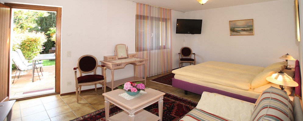 immerso nel verde il nostro piccolo appartamento famigliare con letto matrimoniale ed opzione per una camera comunicante con due letti singoli, permette di godersi a pieno la tranquillità e pace. Situato in posizione soleggiata a sud con splendida vista dispone di giardino privato con tavolo e sedie, entrata separata, angolo salotto con divano, scrivania, sala da bagno con doccia-WC, asciugacapelli, radio, TV LCD, Internet Wi-Fi gratuito, telefono, cassaforte, con angolo cucina, minibar, macchina da caffè Nespresso. Camere con facilitazioni per disabili. |